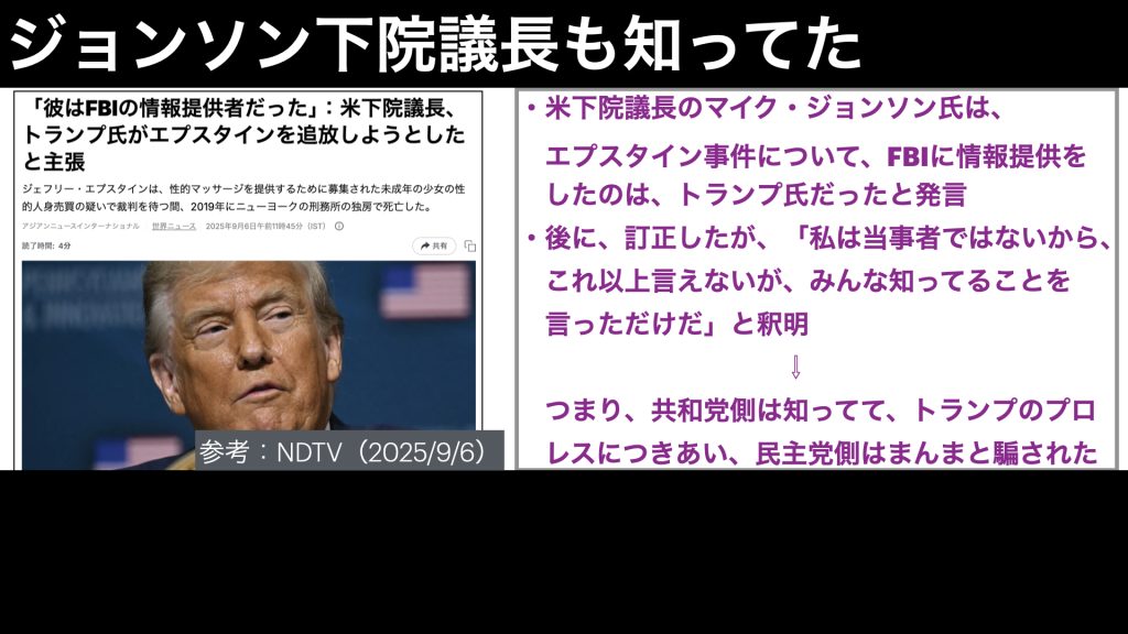 さらに、今年9月に、マイク・ジョンソン下院議長が、エプスタイン事件について、FBIに情報提供したのは、トランプ氏だったと発言しています。