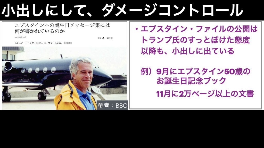 これによって、やっぱりトランプとエプスタインは、そういう仲だったんだ。だから、それをこれ以上騒がせないために、訴訟をちらつかせたんだという印象が広がりました。