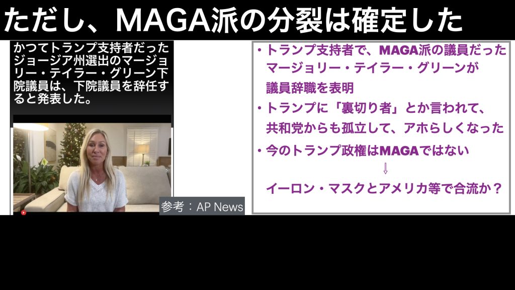 11月22日に、トランプ氏の熱狂的な支持者で、MAGA派のマージョリー・テイラー・グリーン氏が、議員辞職を表明しました。