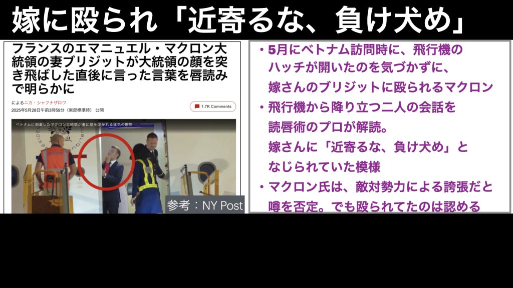今年5月に、マクロン夫妻がベトナムを訪問した際に、飛行機のハッチが開いていたタイミングで、嫁さんに顔を突き飛ばされたマクロン大統領の動画が話題となっていました。