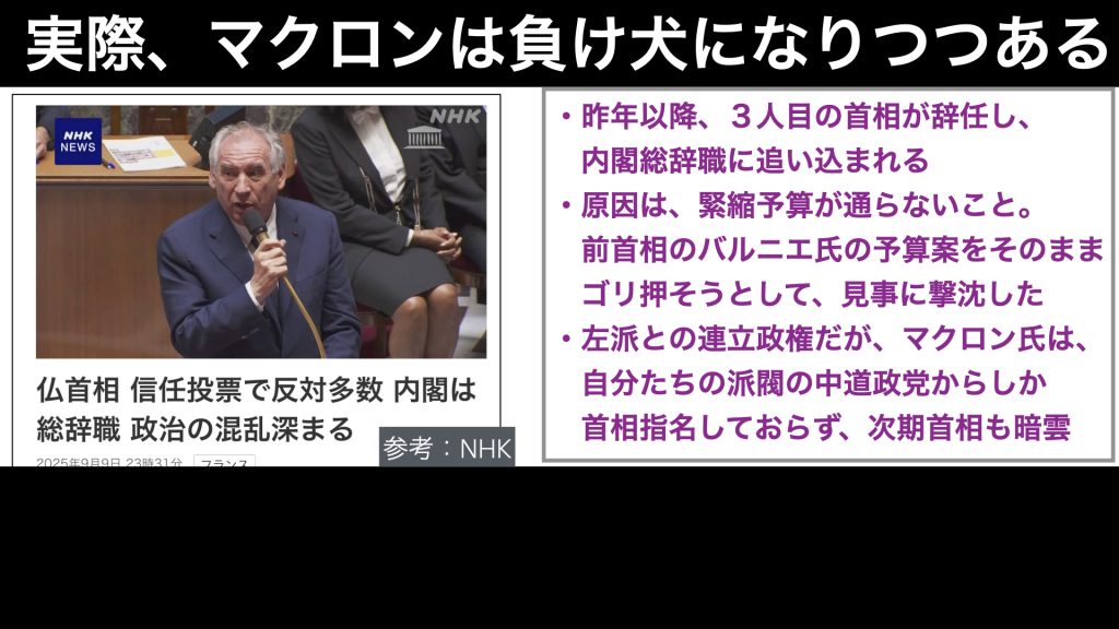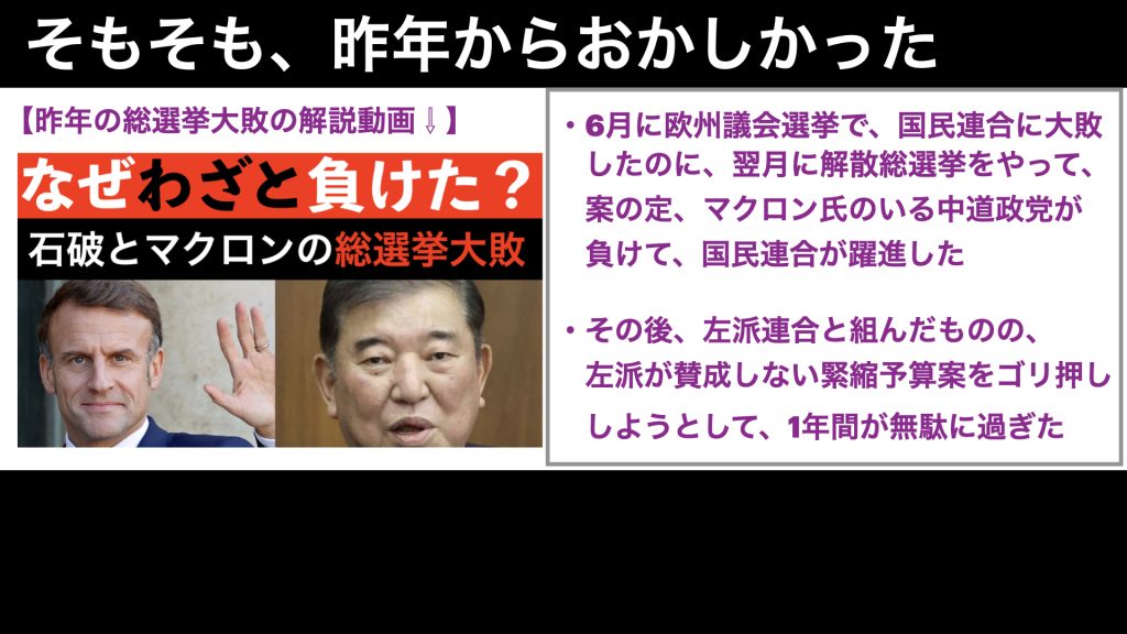 昨年6月に、欧州議会選挙で、ルペン氏率いる国民連合が大勝ちしたのですが、何をとち狂ったのか、この結果を受けて、マクロン氏はフランス議会を解散させて、総選挙を行い、見事に国民連合に敗北しました。
