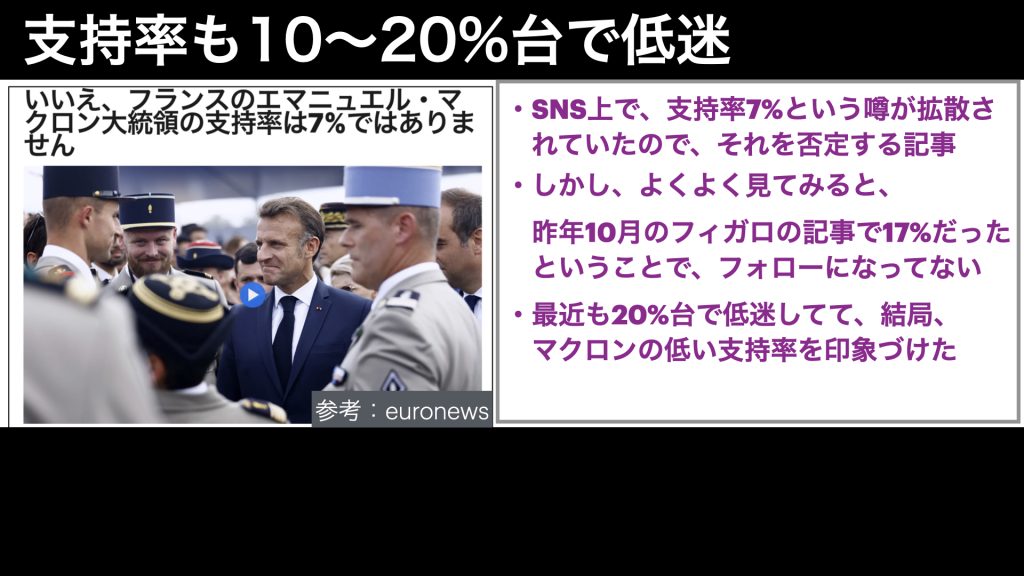 こんな状況なので、マクロン大統領の支持率は低迷を続けています。SNS上では、7%まで下がったなんて話まで出ています。