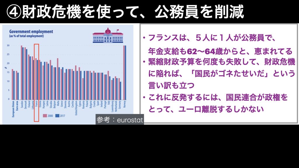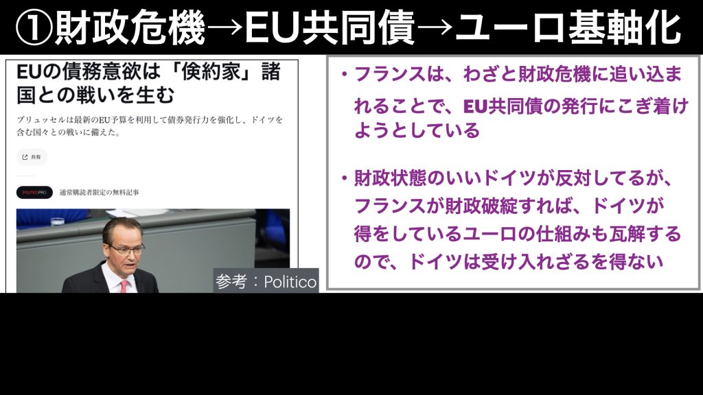 なので、フランスが財政危機を表面化させることは、この不平等な仕組みを修正するとか、EU共同債をさっさと導入するとか、そういう議論も起こると思いますし、それを狙っていると思います。