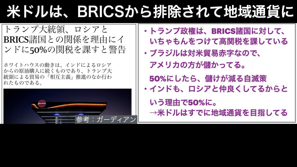 それは、最近のBRICS諸国との関税交渉でも明白です。インドやブラジルなどの、BRICS諸国には、なんと50%もの関税をかけているのです。