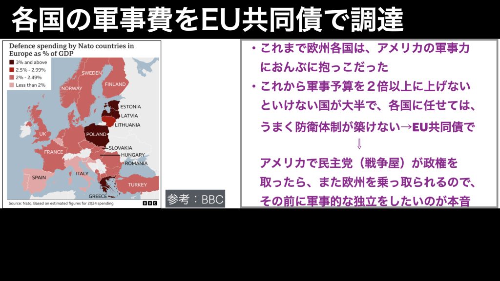 そして、トランプ氏が欧州は自前で軍備を整えろと、NATO各国にGDPの5%にまで軍事予算を引き上げさせる約束を取り付けたことで、財政的に苦しい国でも、資金を調達しやすくなるようにと、2028年ごろを目処に、EU共同債を使えるようにしようと議論がされている最中なのです。