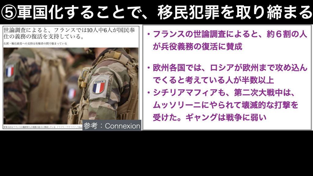 5つ目が、軍国化することで、移民犯罪の取り締まりを大っぴらにできるということです。