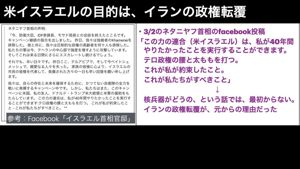 これまでは、核兵器がどうのとゴタゴタやってるように見えましたが、それは表向きの理由であって、そもそも、イランの政権転覆が、元からの理由だということがわかります。