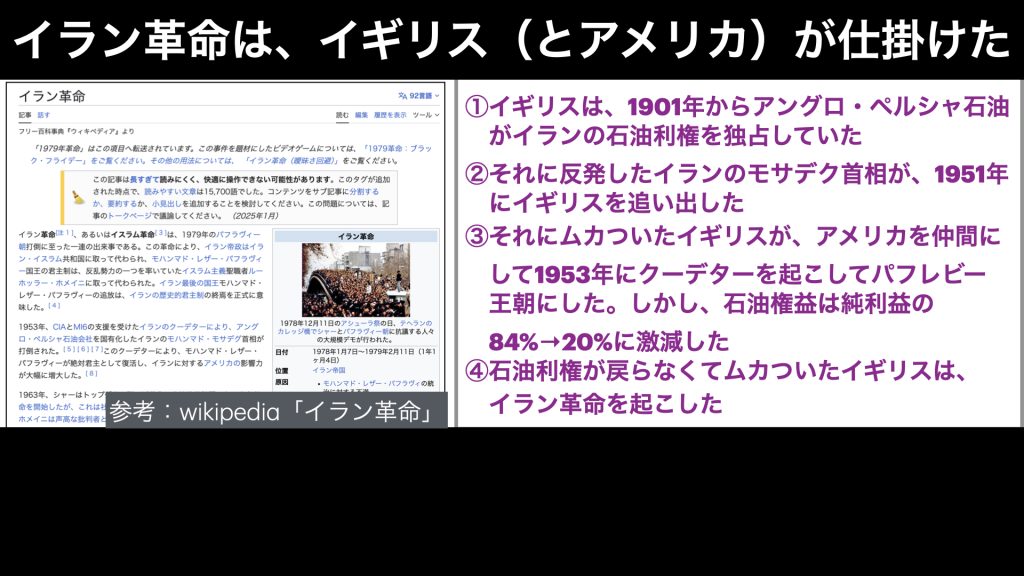 つまり、イラン革命とは、アメリカとイギリスがやったんだというわけです。では、具体的にどういうことなのか?見ていきましょう。