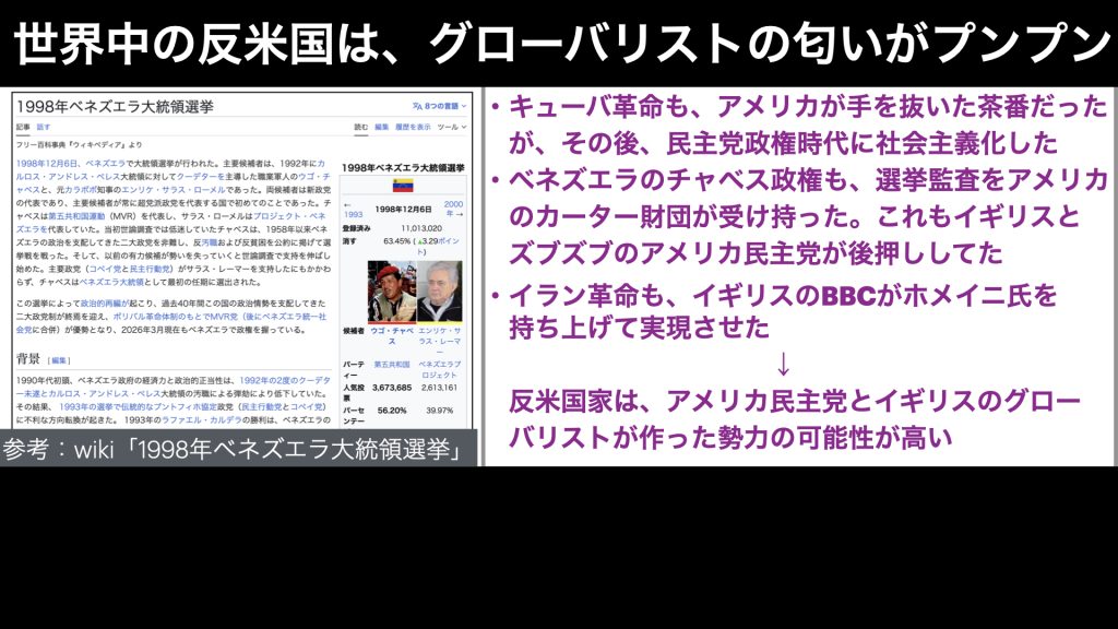 中東や中南米を不安定化したままで得をするのは、武器を売れる軍需産業などのグローバリストです。現在、トランプ政権が、これらの国々を潰しに行ってるのは、このような構図を壊したいということではないかと思いますね。