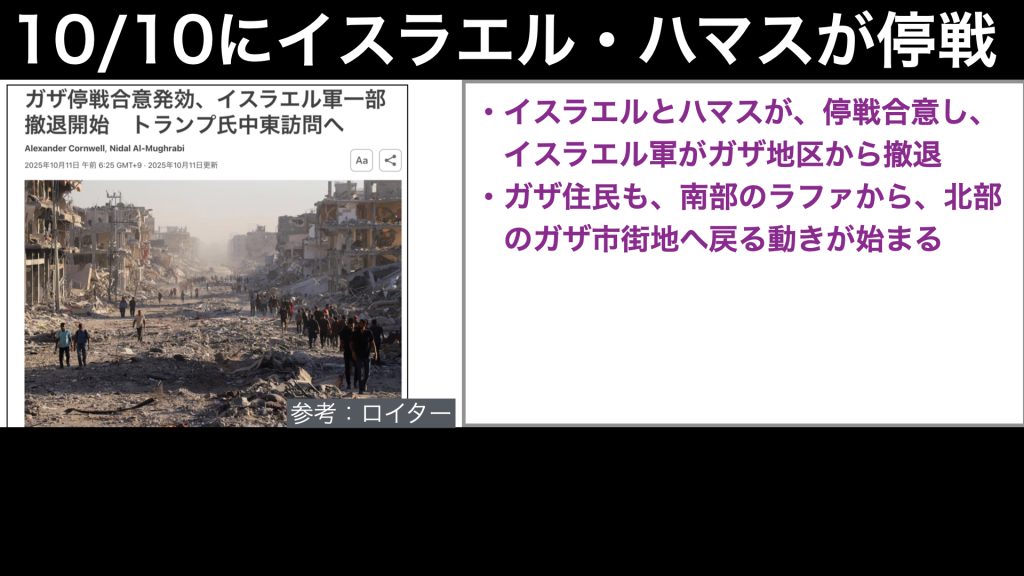 10月10日に、イスラエルとハマスが、停戦合意を結び、イスラエル軍がガザ地区から撤退しました。