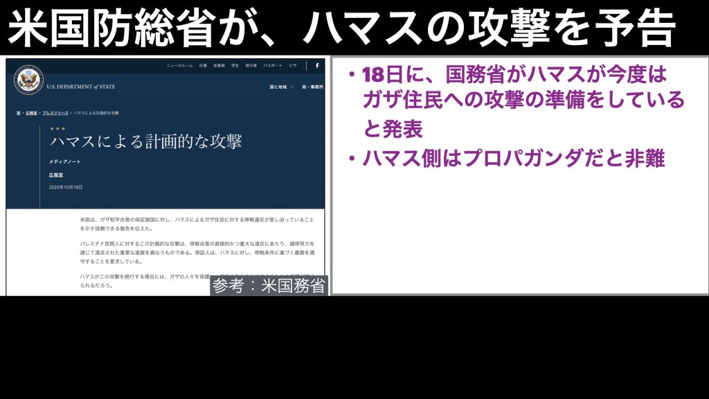 停戦から8日後の18日に、アメリカの国務省が、ハマスが今度はガザ住民への攻撃を準備をしていると発表しました。