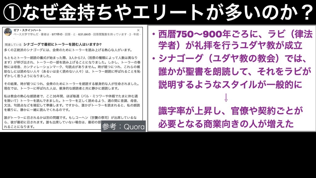 1つ目は、なぜユダヤ人は金持ちやエリートが多いのか?という点です。