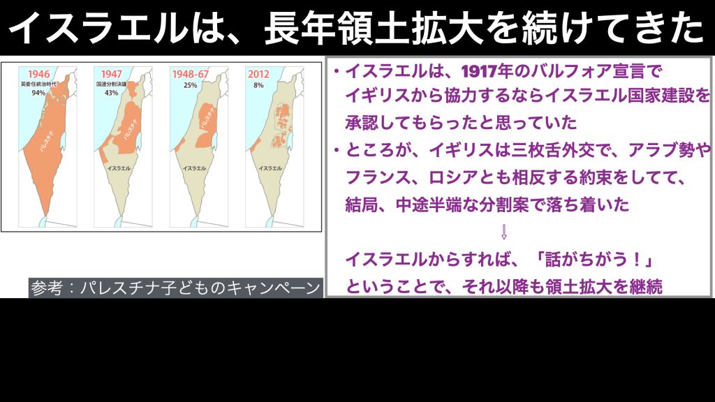 なので、イスラエルとしては、ホロコーストという記憶もありますし、19世紀後半から盛り上がってきた、シオニズム運動を支持する人も、世界中にいますので、イスラエルからアラブ民族であるパレスチナ人を全員追い出そうと、長い間続けてきたわけです。