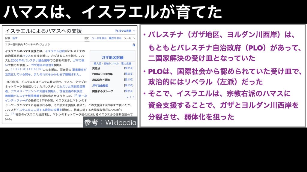 このPLOは、ガザ地区とヨルダン川西岸のどちらも代表する組織だったのですが、これを分断して、弱体化させるために、ガザ地区で宗教右派のハマスを台頭させるために、資金援助をしていたのが、イスラエルだったというのです。