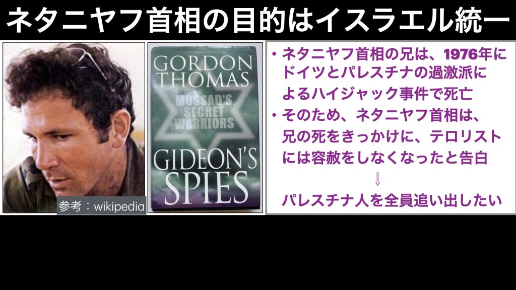 また、この計画を実践しているネタニヤフ首相は、お兄さんが1976年にドイツ人とパレスチナ人の過激派によるハイジャック事件で死んでいます。