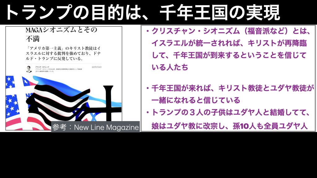 一方で、トランプ氏がイスラエルを100%支援しているのは、千年王国の実現を支援したいということがありそうです。