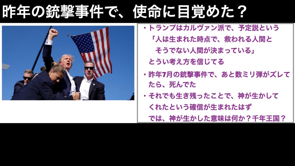 トランプ氏の信仰するカルヴァン派は、予定説という「人は生まれた時点で、救われる人間とそうでない人間が決まっている」という説を信じている人たちですから、まさに自分は選ばれた人間であり、神が自分を生かした意味は何か?といったことを考えているはずです。