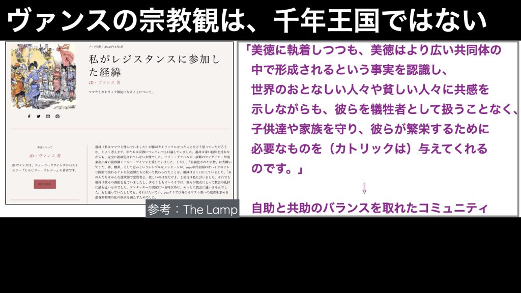 ヴァンス氏は、貧困家庭に生まれて、祖父母に育てられたため、家族の復活とか、助け合える共同体とか、そういうことを宗教に求めている人ですし、現在のMAGAと言われる人たちと共有する価値観を持っている人です。