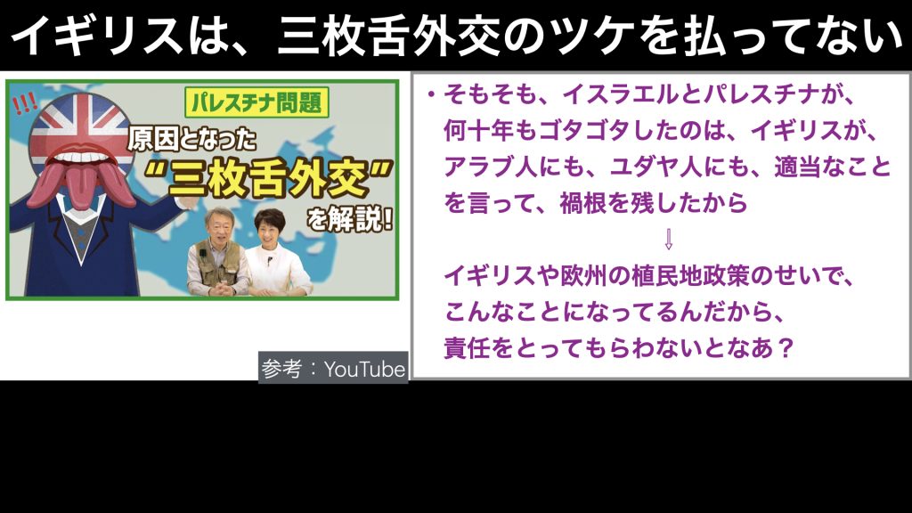 そもそも、現在のイスラエルとパレスチナの紛争は、イギリスの三枚舌外交という、舐め腐った外交政策によって、引き起こされたものです。