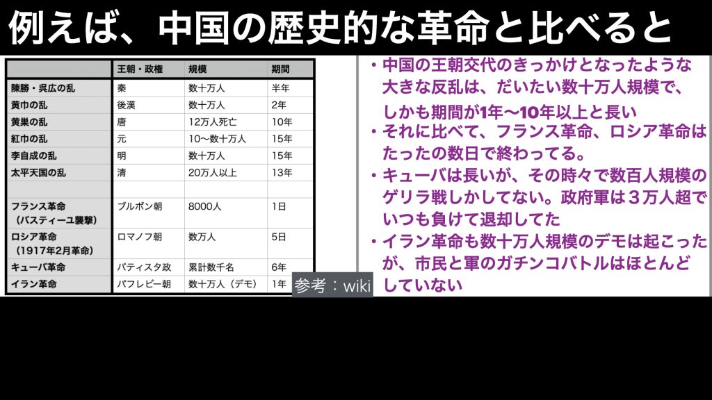という感じで、近現代の革命は、本当に規模が小さいのです。中国のように、全然ガチンコバトルをしていないし、人も対して死んでいません。