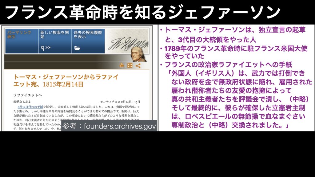 ジェファーソンは、フランス革命当時、駐フランスの米国大使だったので、革命当時の状況を肌身で感じていた人です。そんな人がこんなことを書いています。