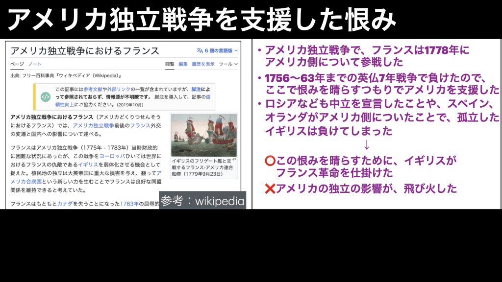 なので、フランス革命は、アメリカが独立したことに触発されて起こったというものではなくて、この時の恨みを晴らすために、イギリスがフランスに仕掛けたクーデターだったというのが、正しい見方だというわけです。