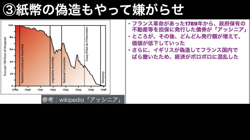 それで、このアッシニアの紙幣をイギリスは、偽造してフランス国内でばら撒きました。