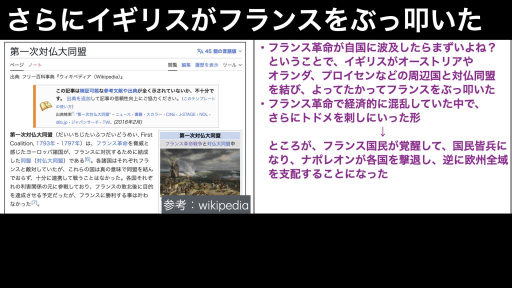 この処刑は1793年に起こったのですが、これによって名実ともにフランスでは王政が廃止されましたので、この革命がうちに来たらやばい、ということで、イギリスが周辺国を取りまとめて対仏同盟を作り、みんなでよってたかってぶっ叩き始めました。