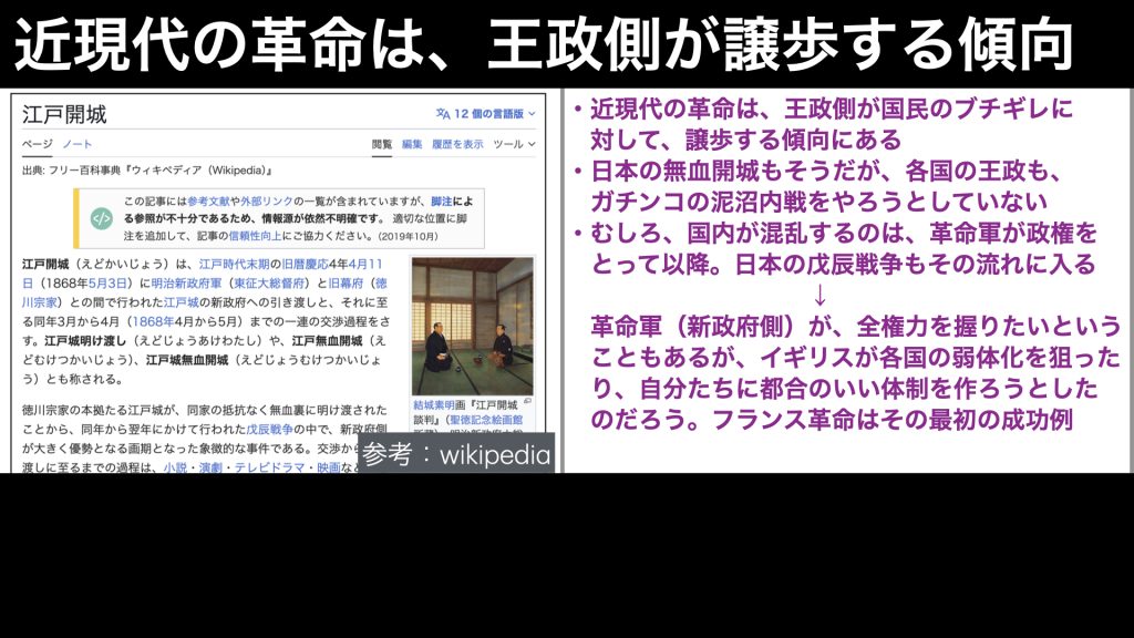 日本も無血開城しましたし、フランス革命でも、ロシア革命でも、イラン革命でも、泥沼の内戦みたいな、そんなことを王政側がやろうとはしてきませんでした。
