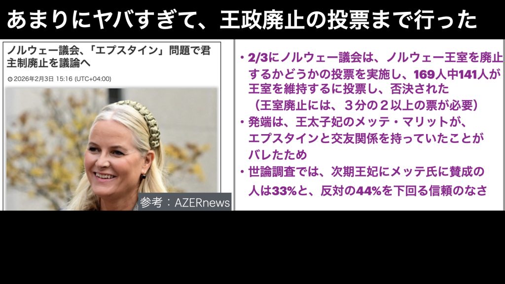 今のところは、ノルウェーとイギリスの王室が、ゴタゴタやってますが、ヨーロッパで王室が残っている国は、まだベルギーやスペイン、オランダ、デンマーク、スウェーデンなど、まだまだたくさんありますので、これらの王室が、これからのエプスタインファイルの公開によって、どれだけ権威が崩れていくのか?追いかけていきたいと思います。
