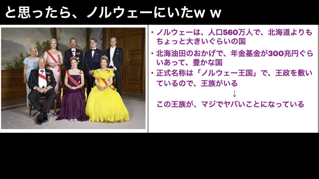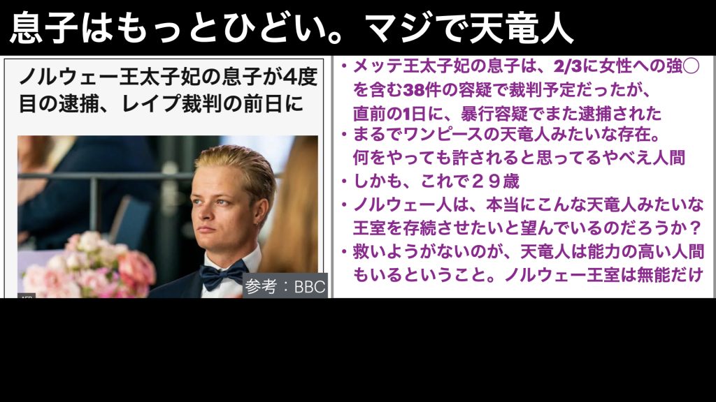 それで、この国は、正式名称がノルウェー王国ということで、王政の国なのですが、ここの王族が、現在、まさに天竜人のような、やりたい放題のクズしかいないということで、話題となっているのです。
