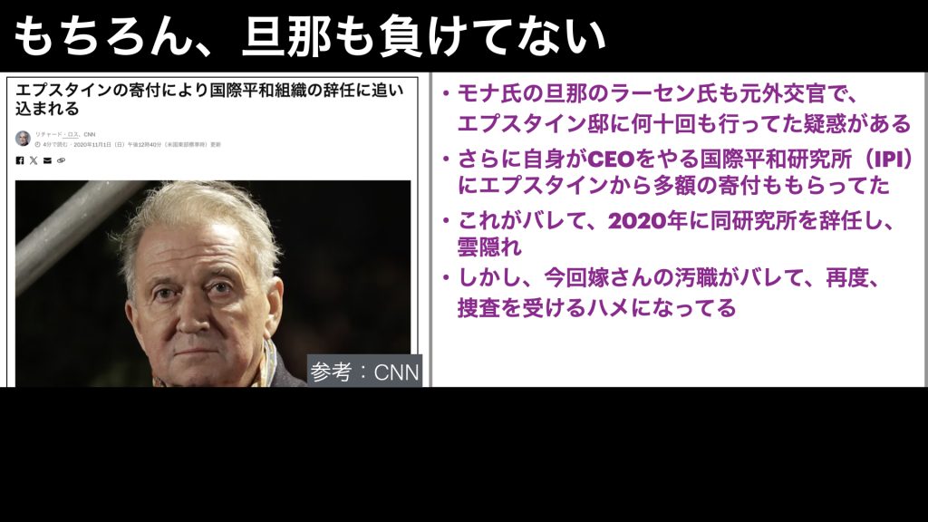さらに、この人がCEOをやっていた国際平和研究所でも、エプスタインから多額の寄付をもらっていたことが判明し、2020年に辞任して雲隠れしていました。
