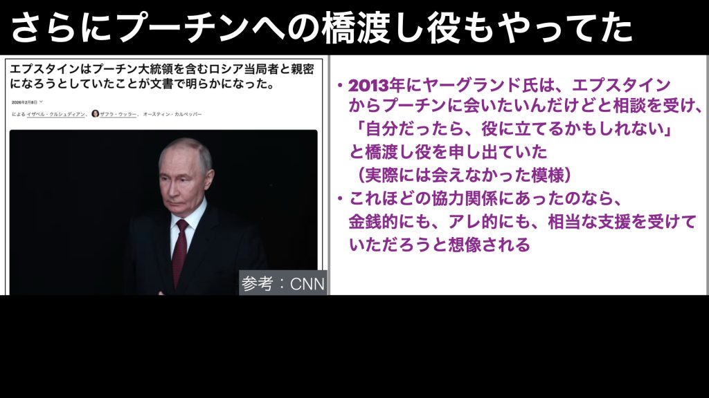 ヤーグランド氏は、2013年にプーチン氏とコンタクトが撮りたかったエプスタイン氏に対して、自分だったら役に立てるかもしれないとメールをしており、2人はかなりの協力関係だったことがわかります。