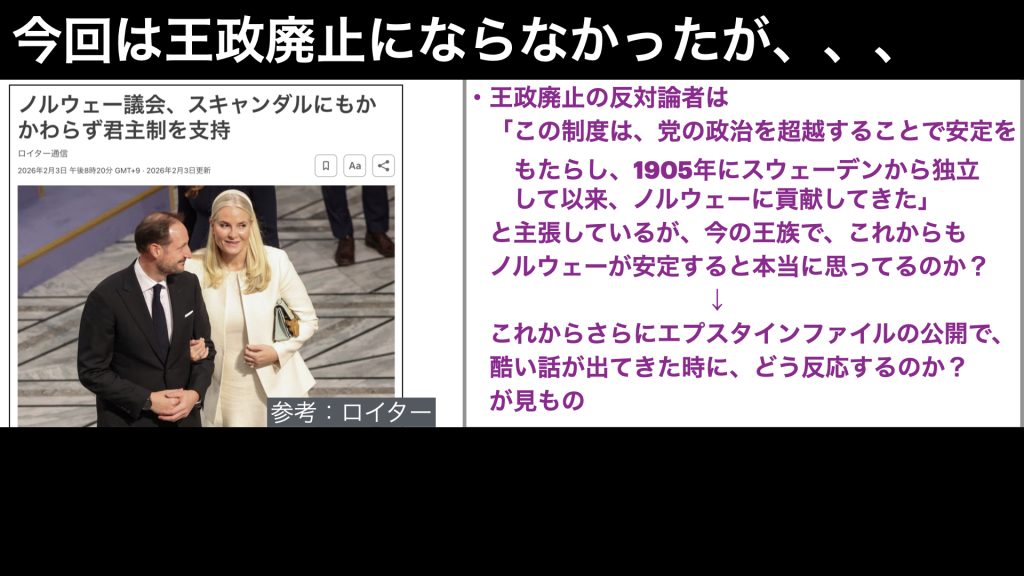 そのため、これからさらにノルウェーの王室や政治家のスキャンダルが出てくるのでしょう。そうなった時に、王政廃止の採決結果が、どのようになっていくのか?見ものですね。