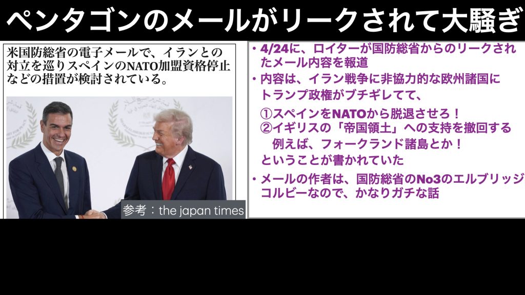 そのため、トランプの逆鱗に触れており、スペインとの貿易をやめるとか、今回のメールでリークされたように、NATOから追放するべきだとか、たびたび脅されているような状況です。