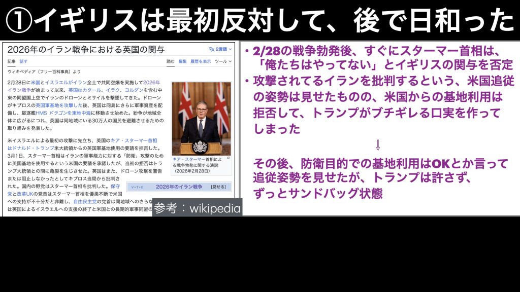 2/28のイラン戦争勃発後、すぐにスターマー首相は、「俺たちはやってない!」とイギリスの関与を否定しました。また、戦争が始まる前にアメリカから協力要請が来ていたようですが、閣僚間での話し合いの上、これを拒否しています。