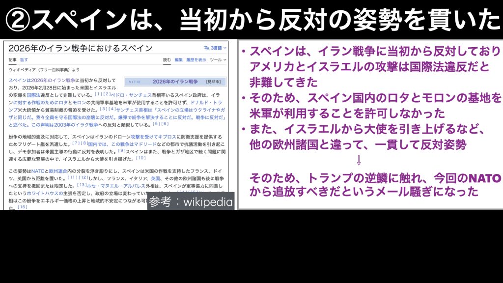 (参考:wikipedia「2026年のイラン戦争におけるスペインの関与」)