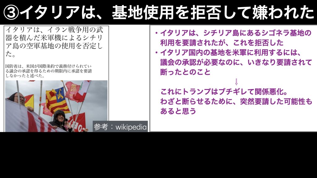 なんでも、イタリア国内の基地を米軍が利用するには、議会の承認がないとできないようなのですが、いきなり要請されたので、それは無理と断ったとのことです。