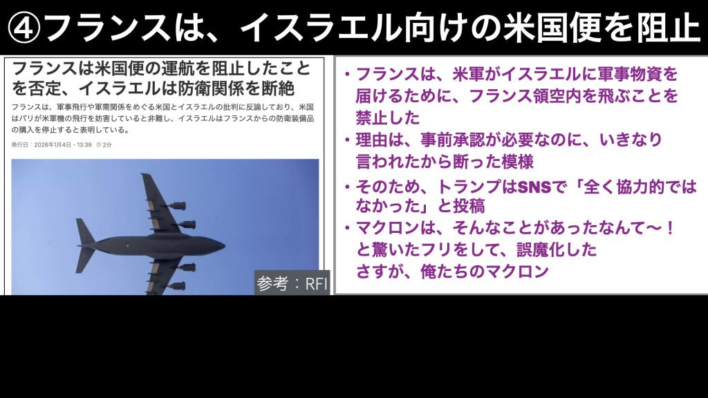 米軍がイスラエルに軍事物資を届ける際に、フランス領空内を飛ぶことを許可してもらおうとしたところ、こちらも、事前承認が必要なところで、いきなり要請されたから断ったということです。