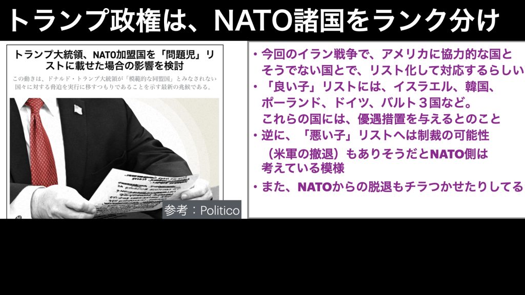 とまあ、こんな感じで、欧州諸国はどこもイラン戦争への協力をしていないわけですが、これを受けて、トランプ政権は、欧州諸国を良い子と悪い子とで、リスト化することを検討しているようです。