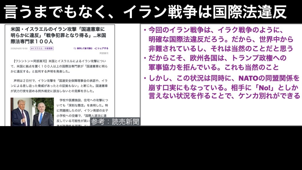 まずこれは誰もが思うところでしょうが、今回のイラン戦争は、国際法に違反しているでしょう。いきなり他の国に攻め込んでるわけですから、こんなことをOKとする国の方が、頭がイカれていると思います。