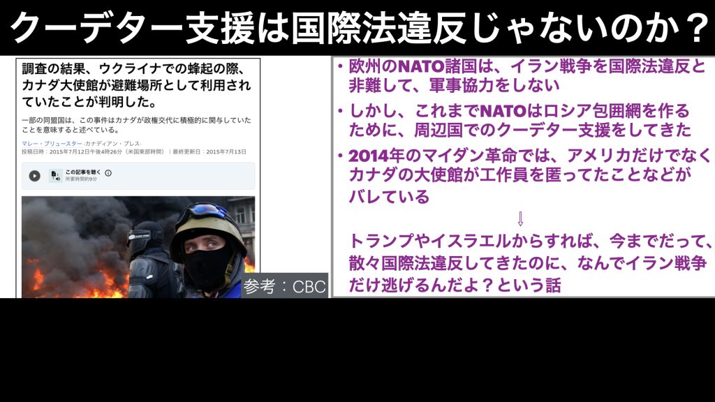 アメリカが資金を出していただけでなく、カナダの大使館が工作員を匿っていたこともわかっています。なので、トランプやイスラエルからすれば、今までだって、さんざん国際法違反してやりたい放題してきたのに、なんでイラン戦争だけ逃げるんだよ?という話なのです。