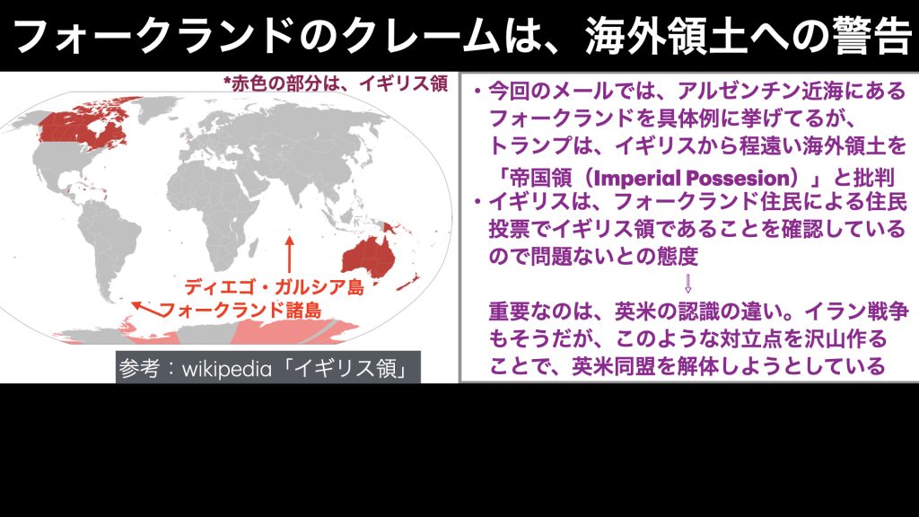 今回のメールでは、このフォークランドを例に挙げながら、「帝国領 Imperial possesion」と言って批判しています。