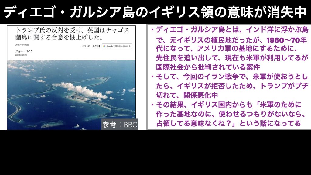 イラン戦争の開戦当初に協力しなかったことをずっと根にもって、イギリスを批判しているのは、このように関係悪化を続けることで、イギリスの海外領土の正当性も崩していくことにつながっているんですね。