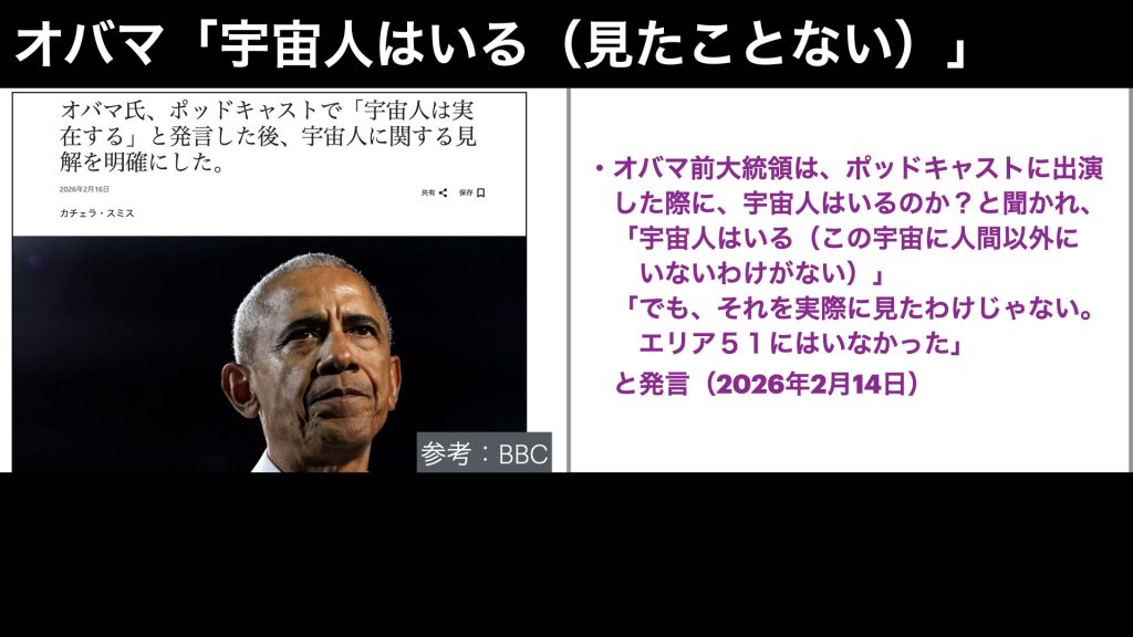 2/14に、オバマ前大統領は、ポッドキャストに出演した際に、宇宙人はいるのか?と聞かれ「確率的に考えると、宇宙人はいると思うけど、自分は見たことがない。エリア51には、そんなものはいなかった」と答えて、話題となっていました。