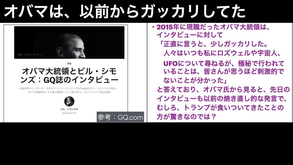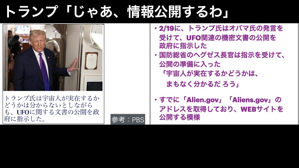 ところが、それから5日後の19日に、トランプ氏はオバマ氏の発言を受けて、UFO関連の機密文書の公開を政府に指示しました。