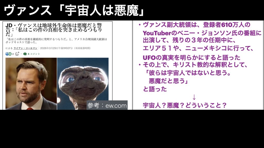 本題はここからで、なぜこんな昔からわかっていたことをトランプ氏がUFO関連の機密文書を公開しろと言ったり、ヴァンス氏が宇宙人は悪魔だなんて言ったりしているのでしょうか?
