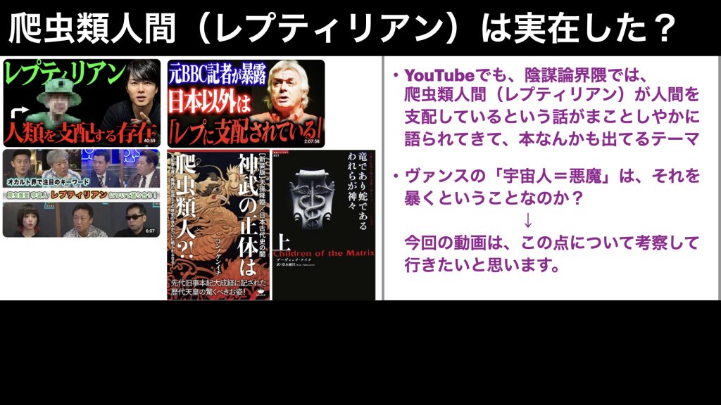 そして、そんなレプティリアンがアメリカとか人類を支配しているという、眉唾な説もあるのですが、ヴァンス氏はこのことをバラすと言っているのでしょうか?