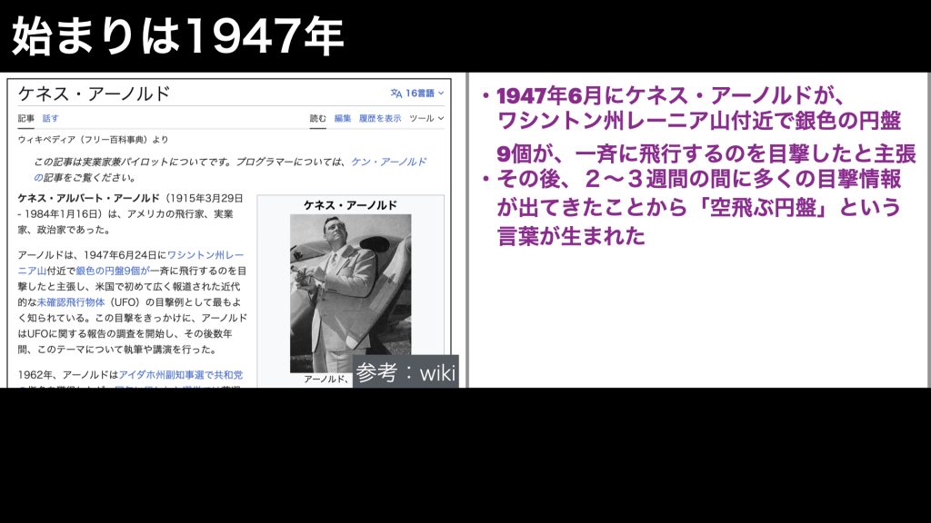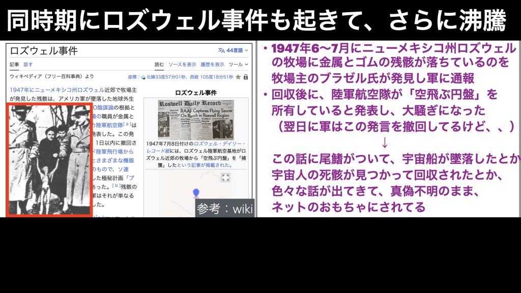 この年の6月に、ケネス・アーノルドという人が、ワシントン州のレーニア山付近で、銀色の円盤9個が、一斉に飛行するのを目撃したと主張し、それが新聞などに取り上げられたことで、それから2、3週間の間に多くの目撃情報が寄せられ、「空飛ぶ円盤」という言葉が生まれました。