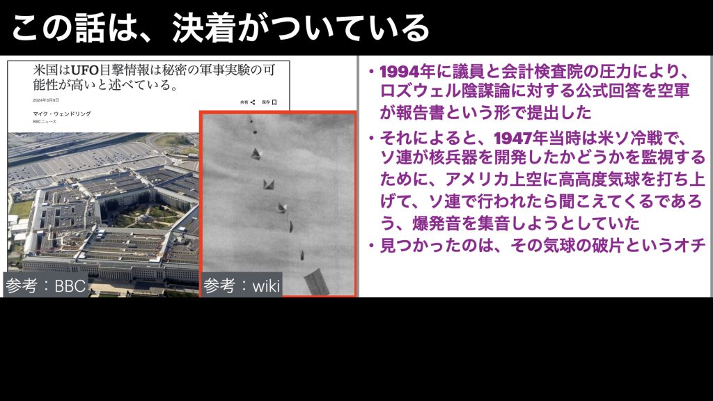 それで、このロズウェル事件というのは、一応決着がついていて、1994年に下院議員と会計検査院が、この陰謀論が本当のところはどうなんだ!と詰めてきたため、空軍が報告書を出しています。
